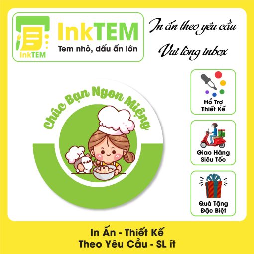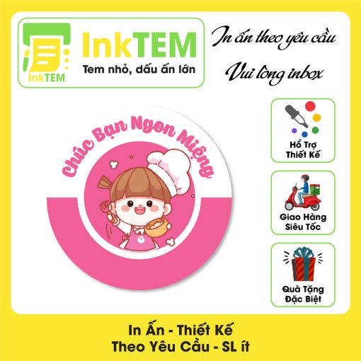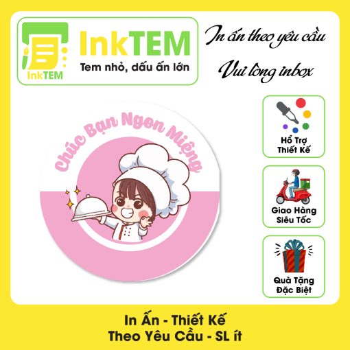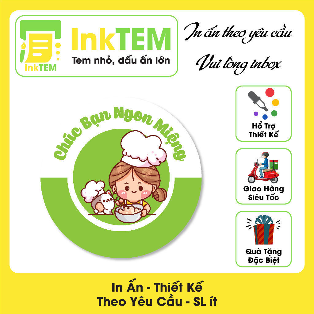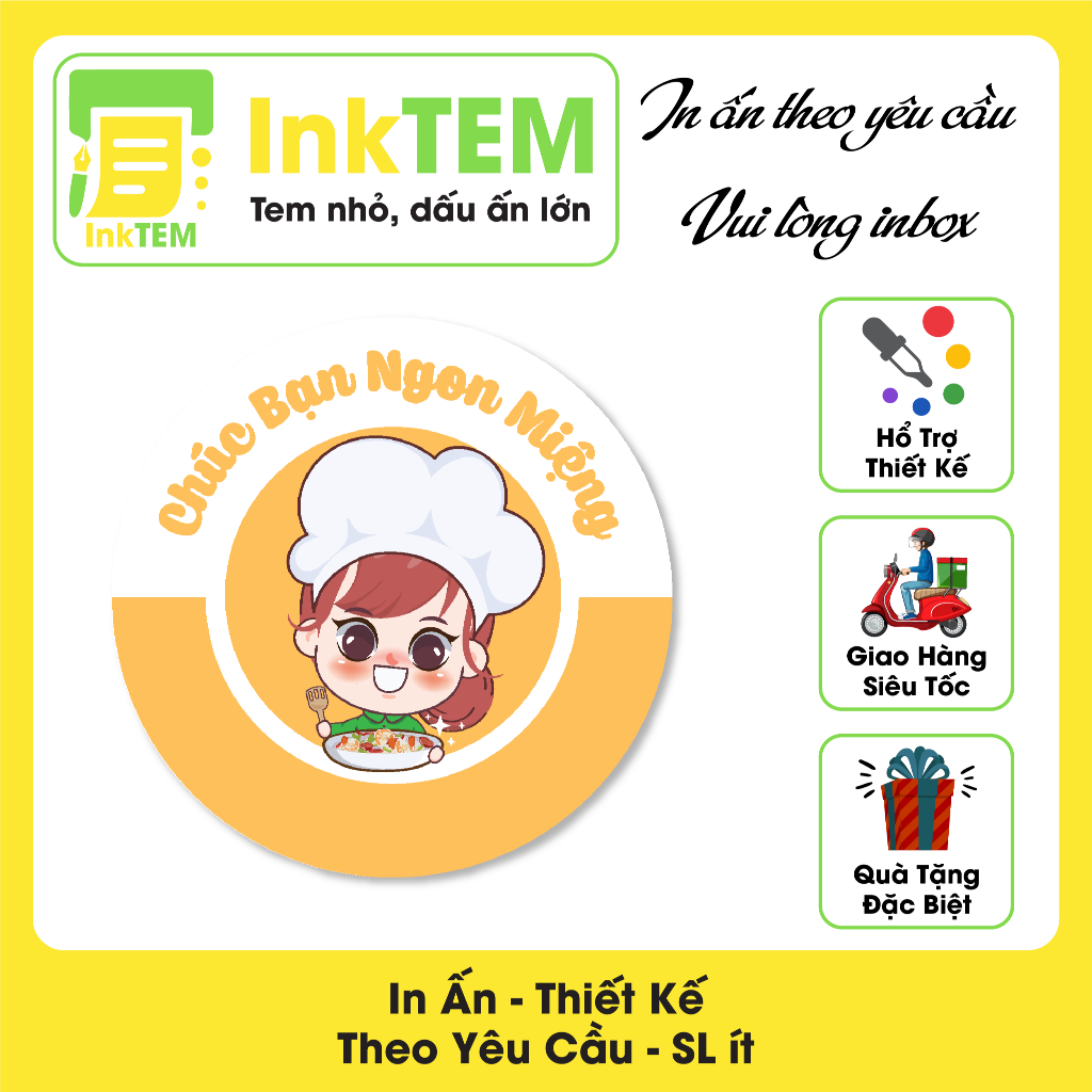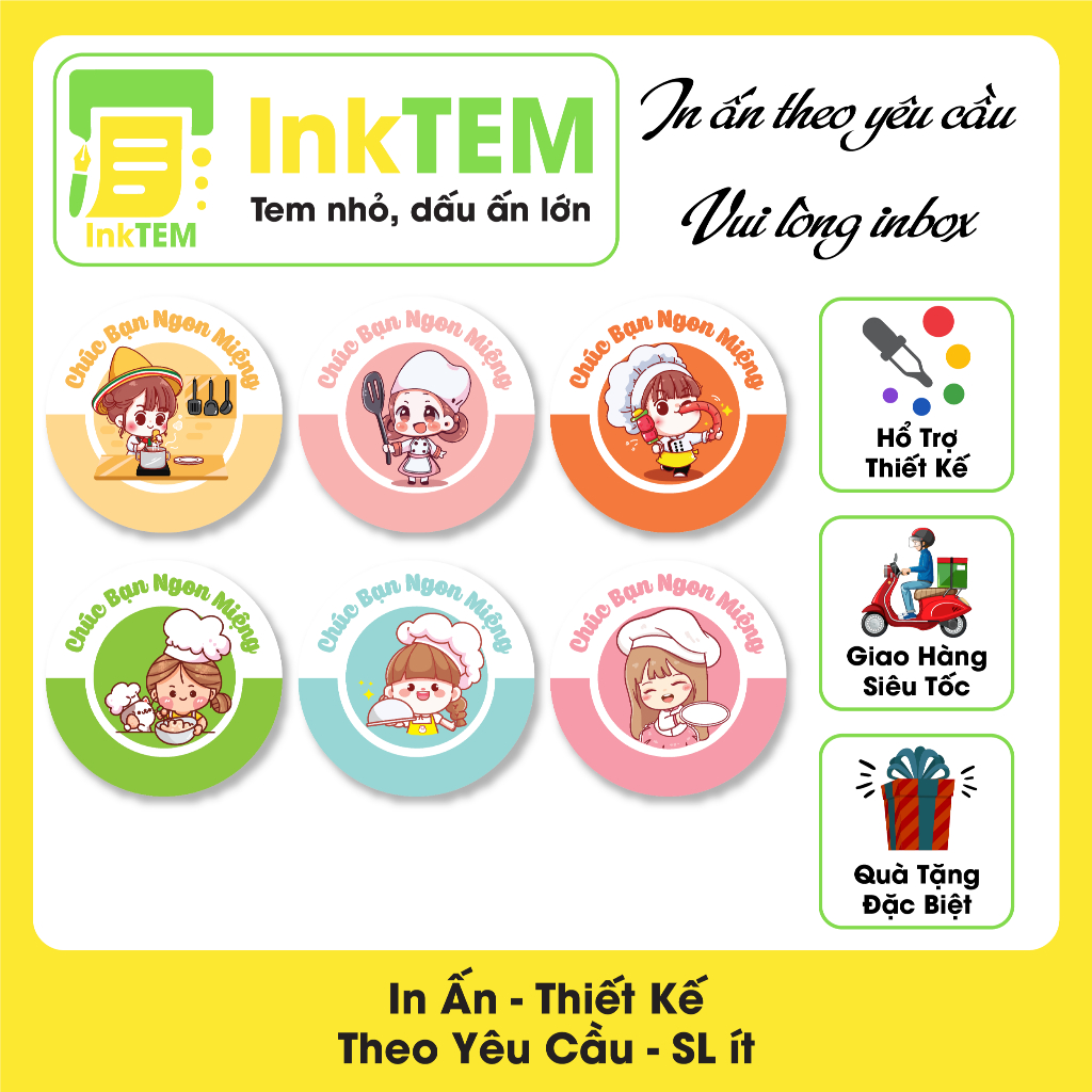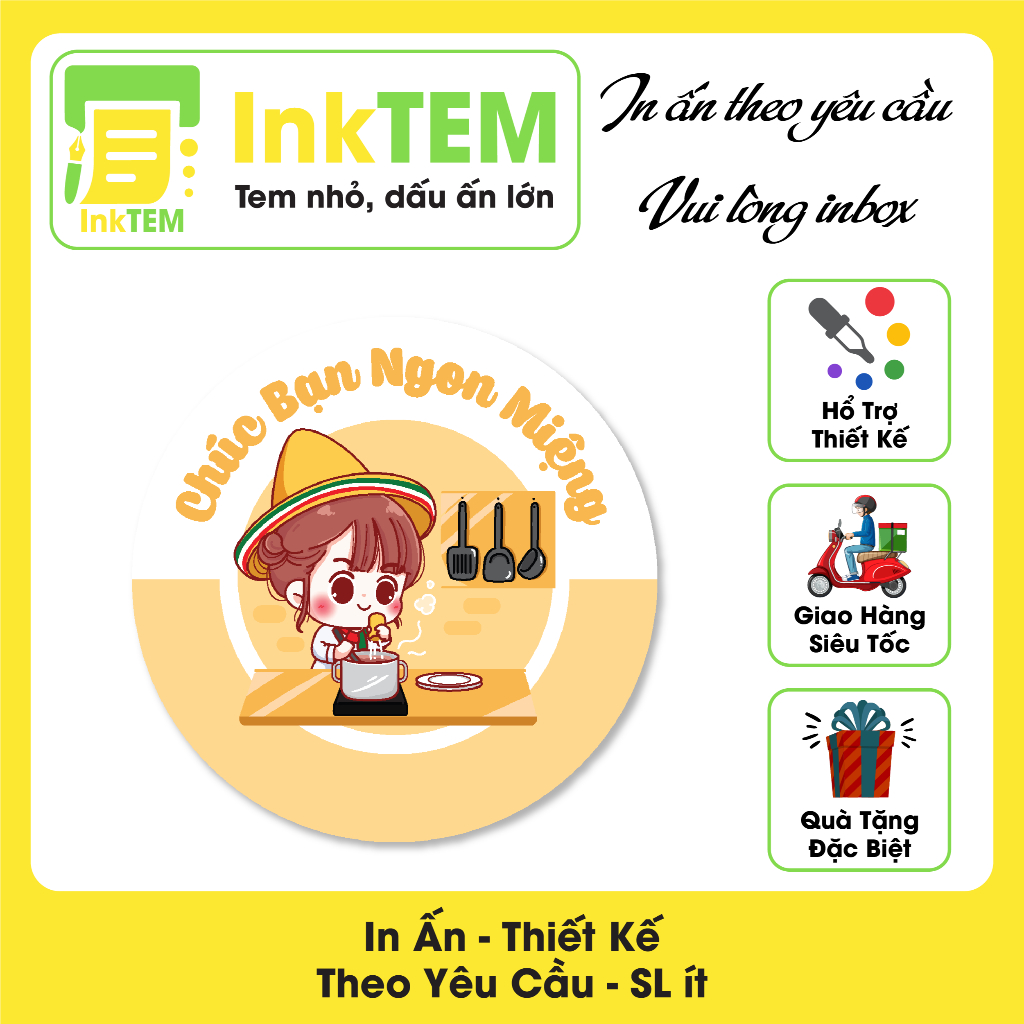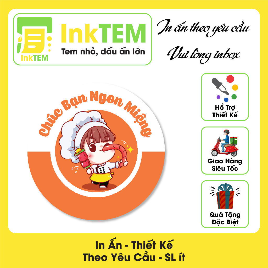 [Sẳn] 100 Tem Nhãn Giấy Decan Dán InkTEM, Chúc Ngon Miệng, Ăn Vặt, Trà Sữa – Kt: 3cm – Mẫu 16-24